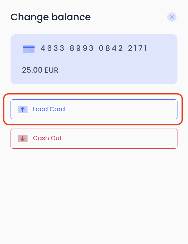 In the Change balance, select Load Card and enter the amount you want to top up the card. Click Submit.