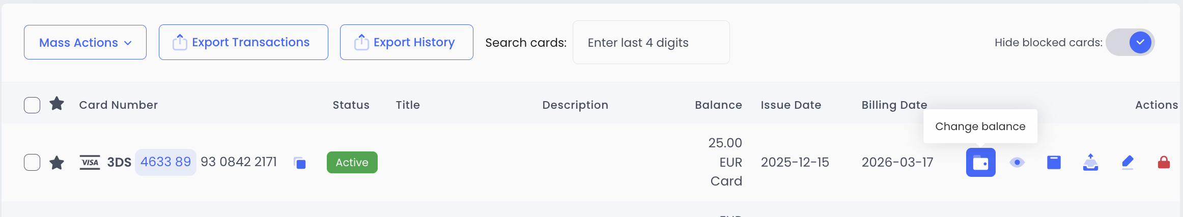 In card actions, click Change Balance.